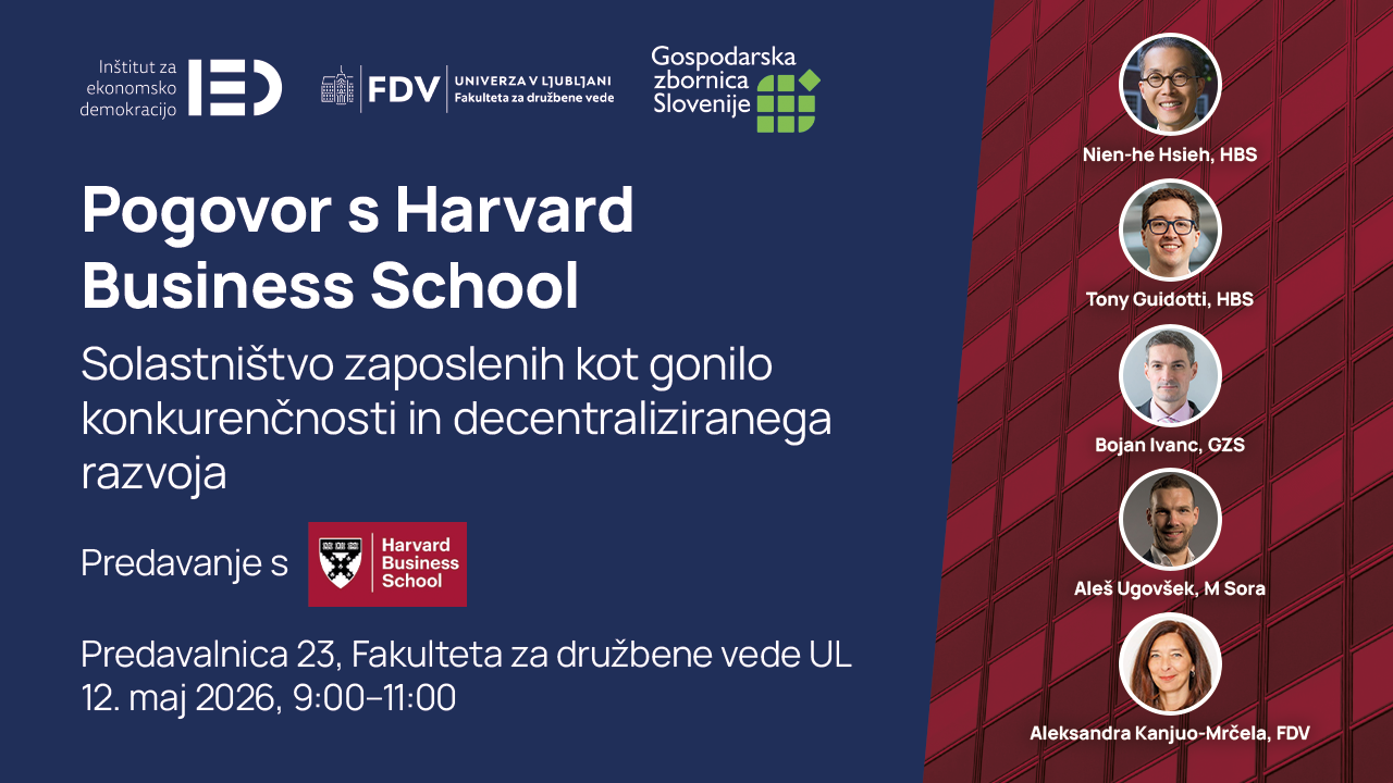 Na dogodku, na katerem bomo gostili predstavnike Harvard Business School, bomo razpravljali, kaj o tem kažejo mednarodne izkušnje iz ZDA, Združenega kraljestva, Kanade in drugih evropskih držav ter kakšne možnosti za razvoj solastništva zaposlenih ponuja slovenski institucionalni okvir. Lepo vabljeni!