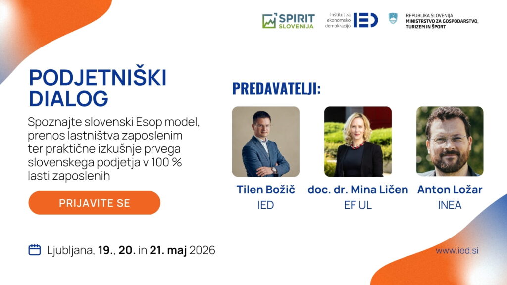 Poleg tega boste imeli priložnost slišati tudi izkušnjo iz prakse – svoje uvide bo delil predstavnik podjetja INEA, prvega slovenskega podjetja v 100 % lasti zaposlenih.